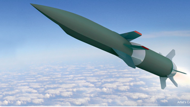 This artistic illustration depicts the Hypersonic Air-breathing Weapon Concept, which will merge Raytheon Technologies’ air-breathing hypersonic munitions with scramjet combustors…