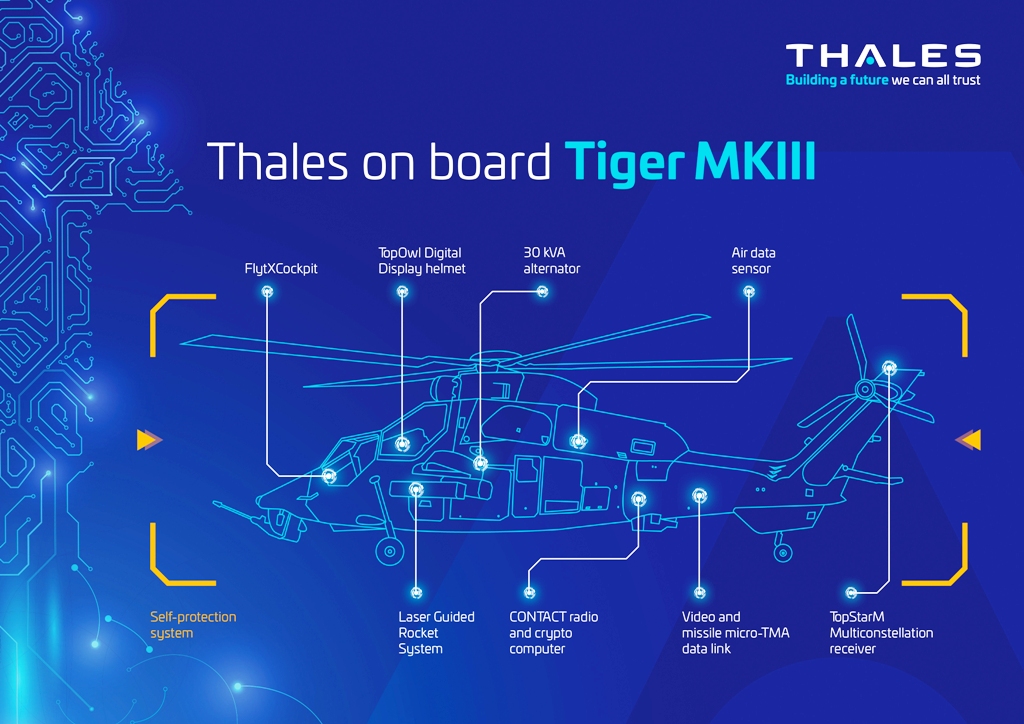 The Organisation for Joint Armament Cooperation (OCCAR), representing the Direction générale de l’armement (DGA) for France and the Dirección General de Armamento y Material (DGAM) for Spain, has entrusted Airbus Helicopters with the development contract for the new Tiger assault helicopter standard. The Thales technologies integrated within the platform will furnish French and Spanish forces with cutting-edge, high-performance connected systems.